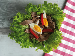 Zutaten: 4 kg Wegschaider Rindfleischsalat (fertig mariniert), Zwiebel, Kürbiskernöl, Ei, roter Paprika