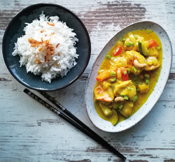 Nebenbei den Reis mit der doppelten Menge Wasser zustellen und gemeinsam mit dem Curry und den Cashew Nüssen servieren.